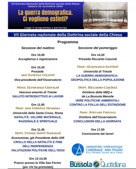 Sabato 22 novembre a Lonigo (VI) si svolge la settima Giornata nazionale di Dottrina Sociale della Chiesa, organizzata da La Nuova Bussola Quotidiana e dall’Osservatorio cardinale Van Thuân, che pone a tema gli argomenti del 17mo Rapporto sulla Dottrina Sociale della Chiesa, dedicato appunto alla guerra demografica. Tra gli ospiti mons. Giampaolo Crepaldi, Ettore Gotti Tedeschi, don Cristian Mendoza e Gianfranco Battisti.