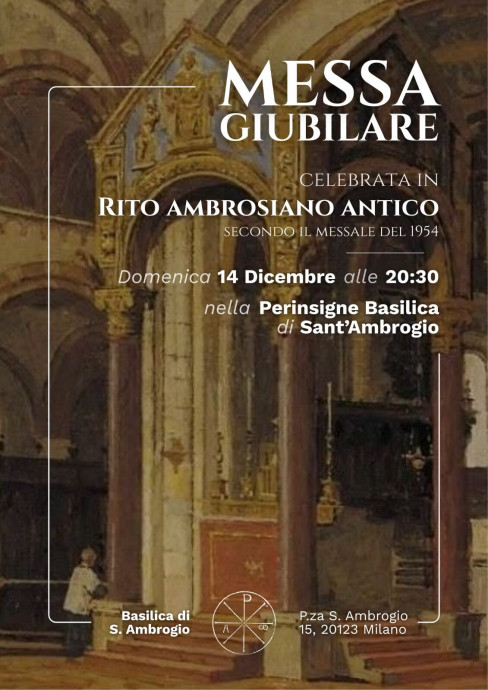 Domenica 14 dicembre 2025 alle 20:30 nella Perinsigne Basilica di Sant’Ambrogio (Piazza Sant’Ambrogio, 15) sarà celebrata la Santa Messa secondo la forma tradizionale del rito ambrosiano.